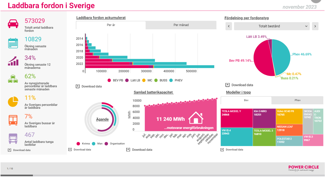 Vi har ett relativt stort överskott av el över tid men den stora utmaningen vi har är att vi kan få effektbrister där vi under korta perioder inte har tillräckligt med el att få fram. Det handlar framför allt om att vårt elnät inte är utbyggt så att vi kan transportera all el till användarna. De stora elnätsaktörerna och Svenskt Kraftnät har fullt fokus på utbyggnaden för att hantera effektbristerna där ny teknik med stödtjänster som till exempel el från batterilager är en del av lösningen. Nedan bild ger dig mer information om laddbara fordon i Sverige (november 2023).