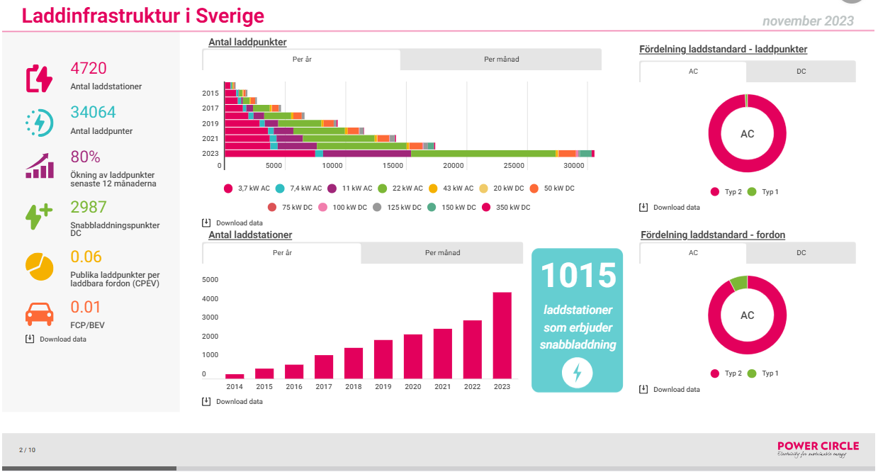 I takt med en ökad elbilsförsäljning ökar även behovet av publika laddare. I slutet av 2023 fanns det ungefär 1000 platser för snabbladdning med i genomsnitt 3 laddpunkter per plats och 3700 platser för destinationsladdning med cirka 10 laddpunkter. Bensinbolagen med OKQ8 och CirkelK i spetsen investerar stort och OKQ8 som exempel kommer att erbjuda snabbladdning på 350 av sina bränslestationer inom några få år. Nedan bild ger dig mer information om laddinfrastrukturen i Sverige (november 2023).